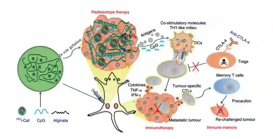 此外,利用纳米材料将免疫疗法与传统疗法如化疗、放疗、光疗等联用,能够增强机体的免疫响应,提高治疗效果。Gu等报道了一种通过水凝胶进行局部活性氧(reactive oxygen species,ROS)响应缓释化疗药物,并且和anti-PD-L1 抗体连用达到高效的肿瘤治疗效果,并可有效控制术后肿瘤的复发。Wang等设计了一种能吸附肿瘤特异性抗原的纳米颗粒,能够被抗原呈提细胞吞噬,提高机体的免疫反应,增强了放疗产生的远端效应及与免疫检查点联合治疗的抗癌增强效果。Liu等制备了一种刺激响应性水凝胶,主要由放射性同位素碘 I31标记的过氧化氢酶、免疫佐剂CpG 以及海藻酸钠构成(图 4)。该策略可通过较低放射性剂量摧毁原位实体瘤,并触发机体的抗肿瘤免疫作用。与免疫检查点抑制剂联用后,能有效抑制肿瘤转移和防止肿瘤复发。Lin等报道了一种基于纳米有机框架的放疗、放疗动力疗法和免疫检查点连用的策略治疗局部和全身肿瘤的治疗策略。Chen等制备了一种共递送 DNA、RNA 分子佐剂和肿瘤新抗原的纳米疫苗。他们通过将沉默 Stat3 基因的小发卡 RNA(shRNA)和DNA CpG引入同一个微米材料中,并通过亲疏水作用装载疏水性新抗原,将复合疫苗协同递送至抗原呈递细胞中。与普通疫苗相比,该协同疫苗能够刺激产生 9倍杀伤性 T细胞,形成相应的免疫记忆。Gao等通过构建高密度脂蛋白纳米载体包载siRNA,再将siRNA安全递送入脑,肿瘤细胞通过巨胞饮“营养蛋白”维持生长和生存的特征,靶向Ras 激活依赖型脑胶质母细胞瘤,沉默相关基因,诱导肿瘤细胞凋亡。