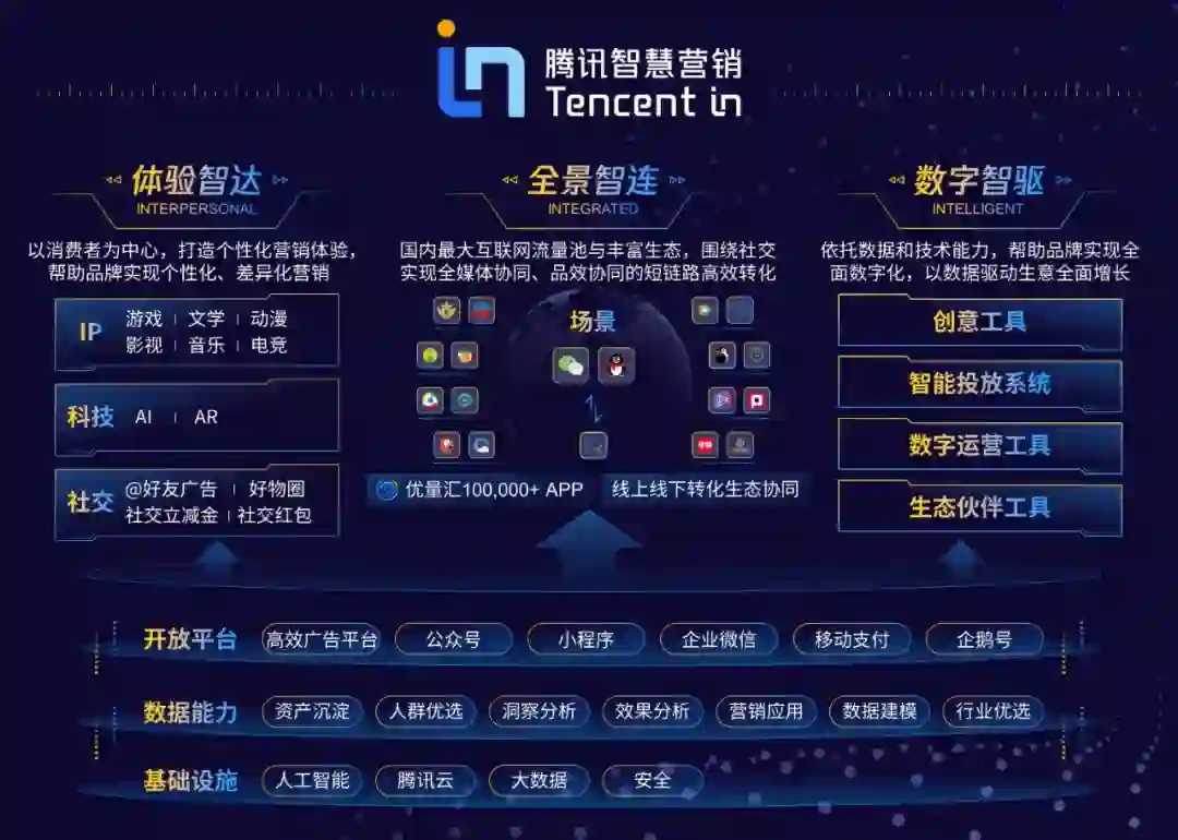 “腾讯智慧营销Tencent In”是以用户为中心,以商业增长为使命,以体验智达(Interpersonal)、全景智连(Integrated)、数字智驱(Intelligent)为核心理念的营销体系,旨在构建品牌与用户之间的美好连接,实现商业智慧增长。