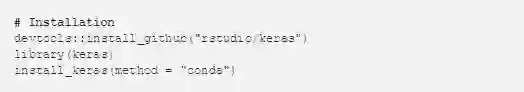 首先,我们需要建立我们的深度学习环境。这可以通过 Keras 包和 install_keras 函数完成。