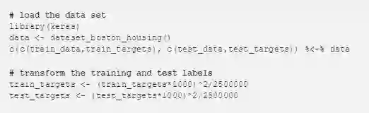 该数据集包括 20 世纪 70 年代波士顿郊区的房价。每个记录有 13 个属性对家庭进行描述,训练数据集中有 404 条记录,测试数据集中有 102 条记录。在 R 中,可以按如下方式加载数据集: dataset_boston_housing()。价格分布直方图显示在下面的左边,其中价格分布从 5 千美元到五万美元不等。原始数据集中不同的价格区间有相似的需求,因此自定义损失函数可能对拟合该数据太大用处。右侧的直方图显示有受益于使用自定义丢失的标签转换。右侧的直方图展示了经过标签转换之后的直方图,将损失函数运用到这些标签上将会获得更好地效果。