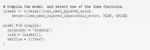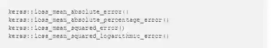 Keras中包含许多用于训练深度学习模型的有用损失函数。例如: mean_absolute_error() 就适用于数值在某种程度上相等的数据集。还有一些函数可能更适合转换后的住房数据,例如:mean_squared_logarithmic_error() 。 下面是由R为Keras提供的损失函数接口: