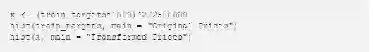 对于如何将价格进行转换,我将标签转换成绝对价格,将结果平方,然后除以大的因子。这产生了一个数据集,其中最高价格和最低价格之间的差异不是 10 倍而是 100 倍。我们现在有一个可以从使用自定义损失函数中获益的预测问题。生成这些图的 R 代码如下所示。