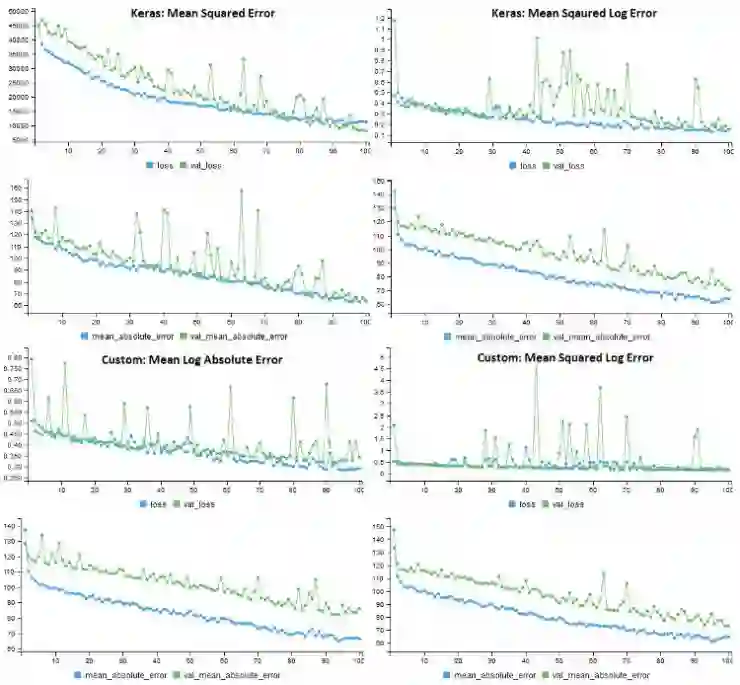 下面显示了转换数据集上四种不同损失函数的模型训练历史。每个模型使用相同的错误度量(MAE),但是具有不同的损失函数。一个令人惊讶的结果是,对于所有的损失函数来说,应用日志转换的方法验证错误率要高得多。
