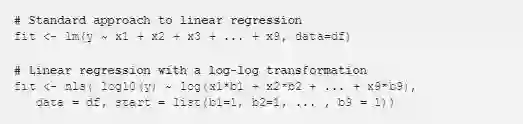 实际上,你可以在 R 中使用非线性最小二乘法(nls)等软件包明确地做到这一点。上面的代码示例演示了如何使用内置优化器来构建线性回归模型,该优化器将使用大标签值对样本进行超重,并介绍如何对预测值和标签执行对数转换的 nls 方法,这将会给样品比较相等的重量。第二种方法的问题是,你必须明确说明如何使用模型中的特征,从而产生特征工程问题。这种方法的另一个问题是,它不能直接应用于其他算法,如随机森林,而无需编写自己的似然函数和优化器。这是针对特定的场景,您希望将错误术语放在日志转换之外,而不是只需将日志转换应用于标签和所有输入变量的场景。
