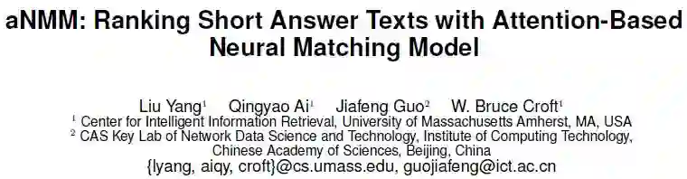作为基于特征工程的问题答案方法的替代方法,最近已经提出了诸如卷积神经网络(CNN)和长期短期记忆模型(LSTM)的深度学习方法用于问题和答案的语义匹配。然而,为了获得好的结果,这些模型已经结合了词汇重叠或BM25分数等附加特征。没有这种组合,这些模型比基于语言特征工程的方法表现得更差。在本文中,我们提出了一种基于注意力的神经匹配模型来对短的答案匹配。我们采用价值共享权值,而不是位置共享权值方案来组合不同的匹配信号,并且注意力机制来衡量问题中判断问题中重要的部分。使用流行的基准TREC QA数据,我们表明,相对简单的aNMM模型可以显着超越已经用于问答任务的其他神经网络模型,并且与具有附加特征的深度学习模型相竞争。当aNMM与附加特征组合时,它的性能优于所有现有的模型。