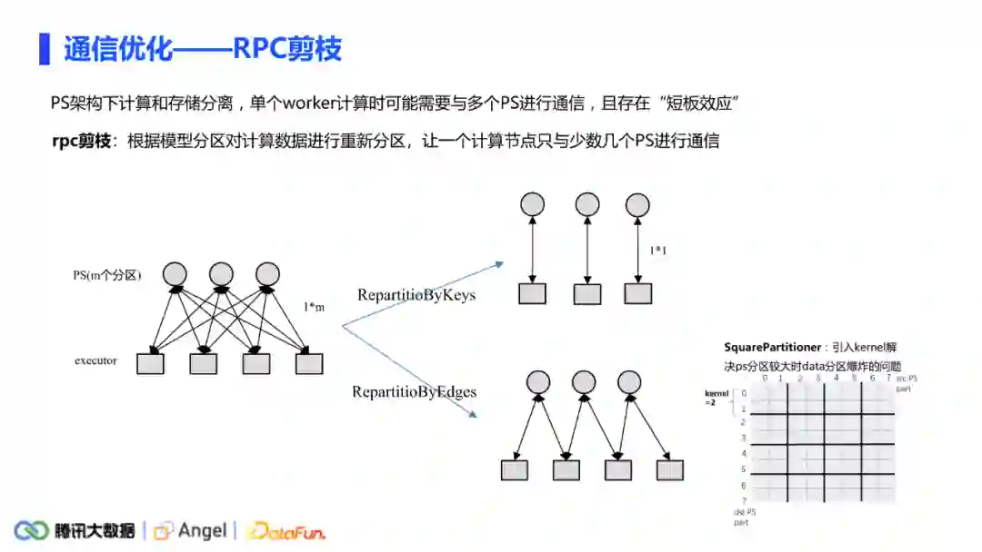 通信链路过多主要是会有一个短板效应。一次pull或push的时间是由最长的RPC决定的。因此可以进行RPC的剪枝,让一个计算节点只与少数几个PS去进行通信。具体做法分为两种情况:第一种情况,当只有源节点(或者key值)需要跟PS通信的时候,完全可以把data分区按照PS分区的方式进行分区,这样完全可以做到executor和PS一对一的关系;另一种情况,当源节点和目标节点同时需要去跟PS进行通信时,我们基于这种情况针对性地提出了Square Partitioner分区方式,其原理如上图所示。假如PS有8个分区,data分区就有64个。每个data分区内获得的边都是根据PS分区来决定的,如图中第0个data分区中的所有边的源节点和目标节点都属于ps的第0个分区,而第1个data分区中的所有边的源节点和目标节点分别属于ps的第0个和第1个分区,依次类推,可以判定每个data分区最多只需要与两个ps分区进行交互。这种方法也会存在当PS分区值较大时导致造成data分区数暴增的问题。此时我们引入kernel的概念,如当kernel等于2时,可以让2*2=4个小分区合并为一个大的data分区,这样每个data分区最多只与kernel * kernel个PS分区进行通信,但data分区的量级迅速减少。这种分区方式在node2vec算法的测试可以让通信时间减少一半以上。