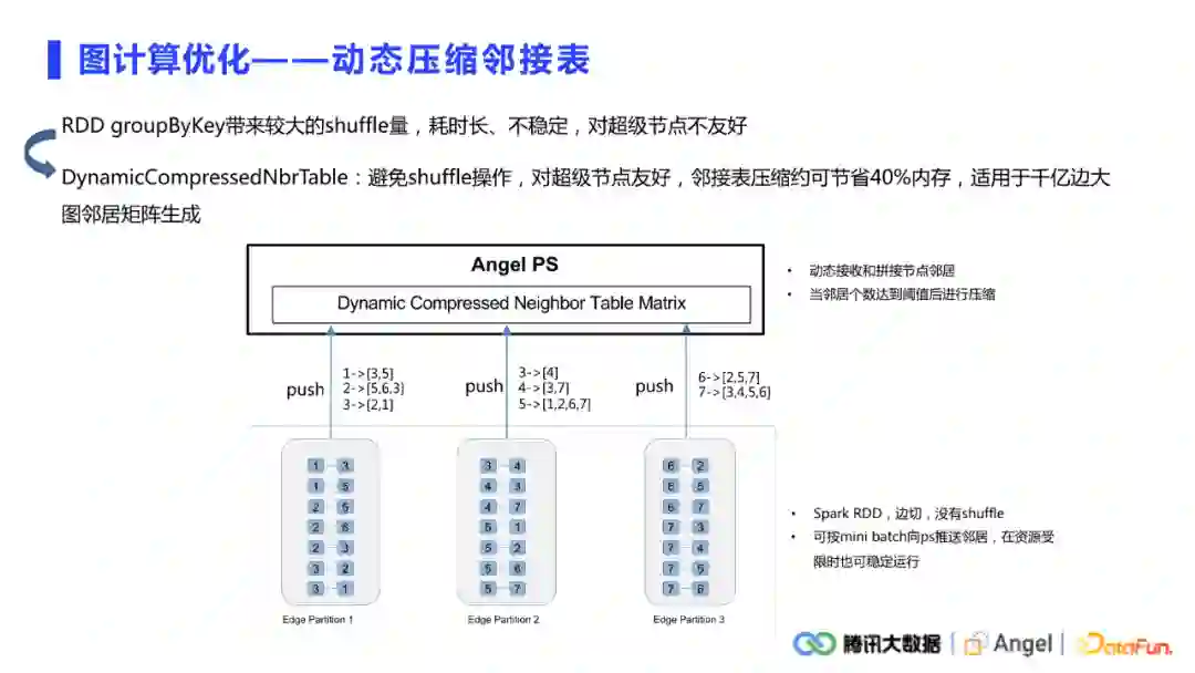 动态压缩邻接表读进来的也是边表的结构,但与之前不同的是不需要用groupByKey事先生成邻接表。当向PS push邻居的时候,只是push当前分区里能拿到的所有邻居。在Angel PS端会自动去做动态接收和拼接邻居的操作,并且当邻居个数达到一定的阈值之后会做压缩,整个过程是没有RDD shuffle的,对于超级节点也非常友好,push过程中可以按照mini-batch向PS做邻居推送,在资源受限的时候也可以稳定运行。