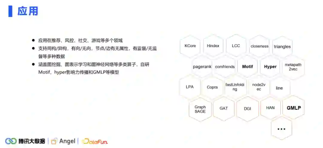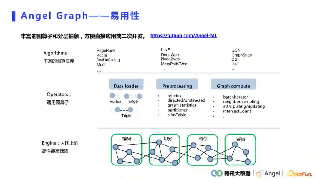 Angel graph的易用性体现在融合了大数据生态,是一个非常容易上手的平台。对于直接使用的情况,系统提供了非常丰富的图算法库,不仅支持了图挖掘、图表示还有图神经网络;对于需要二次开发的用户,系统抽象了许多通用的图算子,涵盖了从数据的加载,到预处理,再到一些常用的图计算算子的抽象。