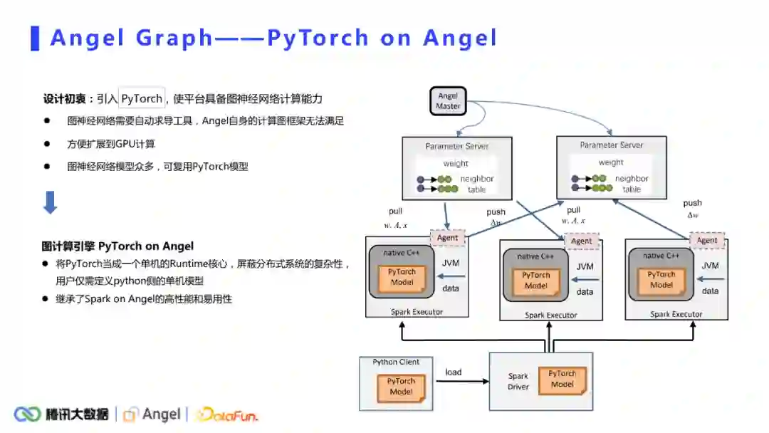 Sparkon Angel是一个基于PS结构的高性能图计算引擎。其架构如上图所示,上面是angel,下面是spark。Spark负责分布式计算,Angel负责存储图模型,主要做内容的随机读取和访问。