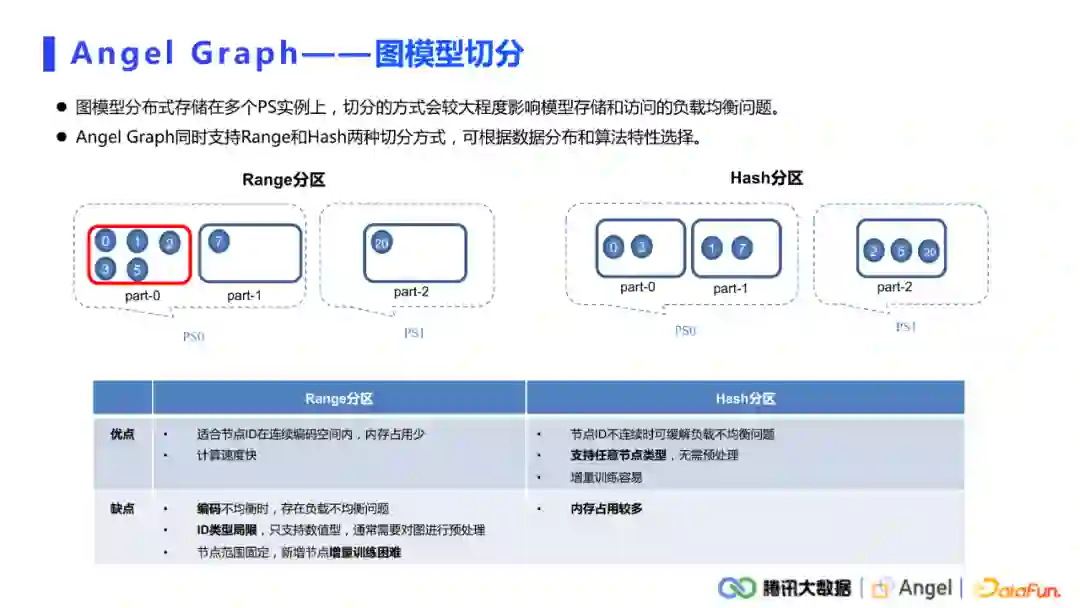 Hash分区。Hash切分通过将ID打散,尽量的分布到不同的PS分区内,很好的缓解了负载不均衡的问题。而且Hash可以支持任意的节点类型,不需要提前将其他数据形式的节点ID编码成Long类型。其缺点是内存占用比较多,在实际使用的过程中,还是要根据具体的数据分布去选择合适的切分方式。