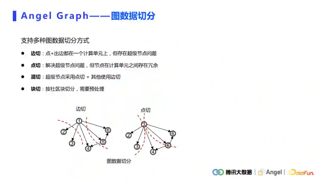 所有的分布式系统都会涉及到数据切分的问题。我们这里有两个分区,一个是Spark端的data分区,还有一个就是AngelPS端的模型分区。对于Spark端的图数据切分,本平台支持了多种切分方式,包括边切、点切、混切,还有块切。其它比较复杂的情况,需要去做预处理。其中点切、边切的方式都是非常简单的。比如,直接从HDFS读边,天然就是一个点切的方式。如果是对边的RDD做group by key操作,形成的就是一个边切的模式,操作起来非常简单。用户可以根据自己数据分布特点和计算逻辑,去选择需要的切分方式。