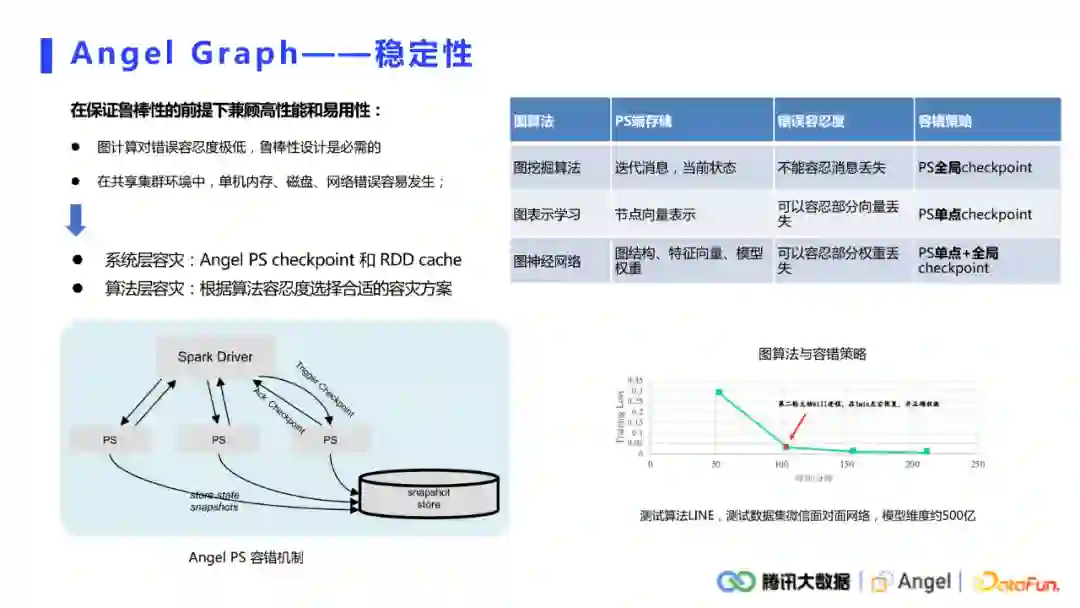 系统层容灾:类似RDDcache,Angel PS端提供了checkpoint功能。用户可以选择让每个PS每隔一段时间checkpoint一下数据。当PS发生宕机时,重启的PS可以去检查是否有之前PS的备份,若有则直接加载进来,继续运算。
