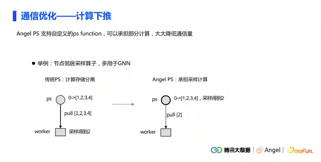 另外一个问题是通信的量比较大,通讯的数据比较多。Angel PS支持自定义PS function功能。Angel PS与传统PS的区别在于它可以做计算,计算的逻辑是由用户自定义的。对于经常要做邻居节点采样的情况,传统PS计算与存储完全分离,在对一个节点做采样时,例如上图左边的情况,worker端从PS把全部邻居拉下来(拉的是1234所有的邻居),然后在下边做采样(得到2)。但是如果PS可以承担部分计算,把采样的功能放在PS上面去做,这样拉的数据就只有2了。整体来看,把通讯的数据大小从边的量级降到了点的量级。