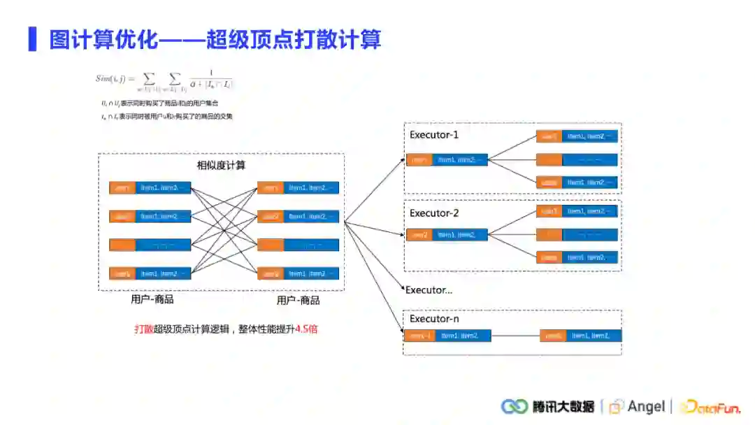 前面的是通信上的优化,计算也是较为关注的一个点。做图计算,超级节点是不可避免的。超级节点会引起负载不均衡的问题,通信会有,计算也会有。在通讯中,负载均衡和一些通讯的策略都可以去缓解。而在计算上有很多常用的trick。举例来说,要计算任意两个商品的相似度,需要找到同时购买了这两个商品的所有用户。比如说100万个用户同时购买了A,B两种商品。这100万个用户各自有一条购买序列,计算A、B两种商品的相似度时有个操作是要去计算这100万个序列的两两交叉项,就形成了一个类似笛卡尔积的运算。100万×100万就达到了一万亿的维度,如果把这种计算放在一个worker上面是完全不可接受的。打散计算的策略是将把这些超级商品对单独提出来,将单个笛卡尔积的多次交叉项计算打散到各个worker上去。总而言之,原来计算的力度是单个的商品对计算,现在是把计算力度打散,降低到单个交叉项上计算,这样就可以将已经空闲的资源全部利用起来,时间上也得到了非常显著的提升。