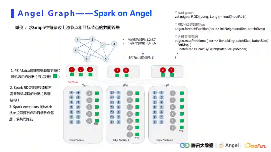 在Spark on Angel架构上,Angel PS用于管理频繁更新和随机访问的数据,这里主要指节点的邻居,也就是我们常说的邻接表。Spark从HDFS中读原始的输入边,形成一个edge RDD。在具体计算时,每一个executor对每一条边从PS中拉取原节点和目标节点的邻居,之后做交集。对于某一些算法,可能需要迭代更新PS上的模型,此时需要用一个push接口将需要更新的数据push到PS上。整个计算过程逻辑上非常简单。在实现上,这里简单列举了比较粗略的代码。可以发现主要都是Spark的接口,中间会穿插一些对PS的push接口,具体主要取决于用户如何处理规划自己的数据。