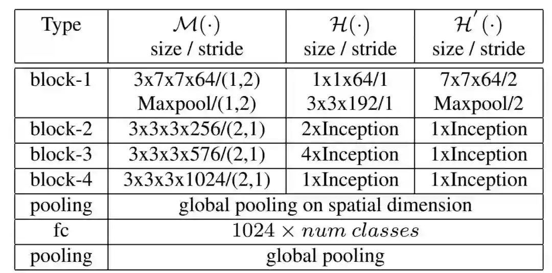 为了验证MiCT的有效性,我们通过将MiCT堆叠在一起,构建一个简单的3D CNN网络MiCT-Net。如图9所示,MiCT-Net由四个MiCT组成,这也意味着我们使用了4个3D卷积。MiCT-Net将RGB视频序列作为输入,可进行端到端训练。表1中提供了网络体系结构的更多信息。我们在网络的最后一层使用时间维度上的全局池,以使网络能够接受任意长度的视频作为输入。