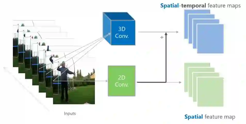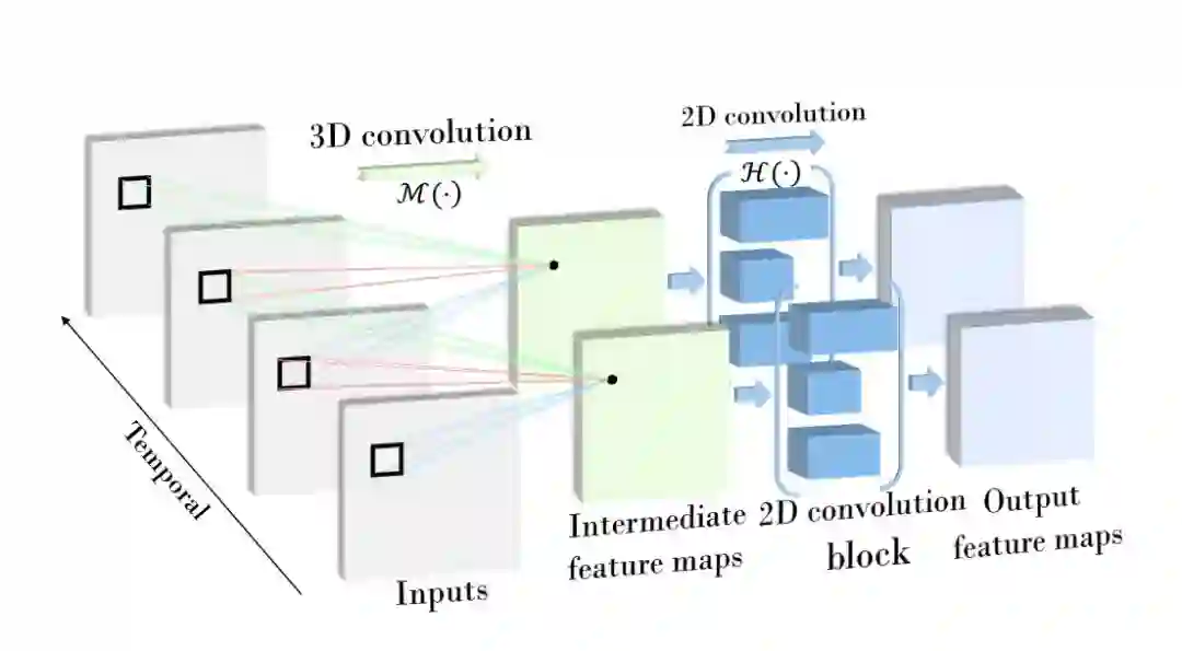 图4:3D卷积特征示例。卷积内核沿3D输入信号的空间和时间维度并生成3D时空特征图。