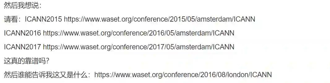 如果仔细观察这几个 AI 假会的网址,我们可以发现一个共同点:里面都包含一个叫「WASET」的组织。