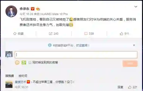 昨日,余承东发微博辟谣称:“飞机刚落地,看到自己又被转岗了。感谢朋友们对华为终端的关心关爱,服务消费者还未拼尽全身力气,岂敢先溜”。