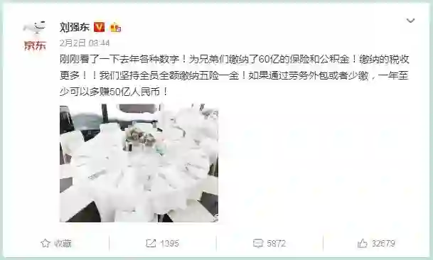 近日,刘强东通过其个人微博表示为京东员工缴纳了60亿的保险和公积金,坚持全员全额缴纳五险一金,并称如果通过劳务外包或者少缴,一年至少可以多赚50亿人民币!