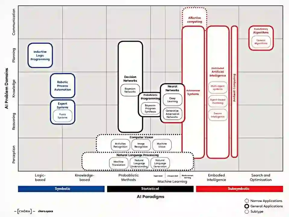 这六种范式还分属三种不同的宏观方法,即符号法、亚符号法和统计法(由上面的不同颜色加以表示)。简而言之,符号方法表明人类智能可以简化为符号操作,亚符号方法是指事前并不提供特定的知识表示,而统计方法基于解决特定子问题的数学工具。