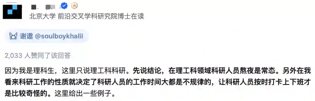 网友纷纷发表了自己对科研加班的看法,一位北大前沿交叉学科研究院博士表示,