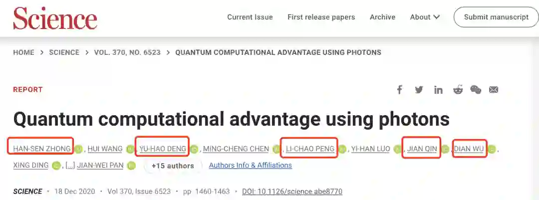 2020年12月4日,他们还是Science那篇九章量子计算机的重磅论文的作者,其中钟翰森、邓宇浩,还有2位同学是共同一作。