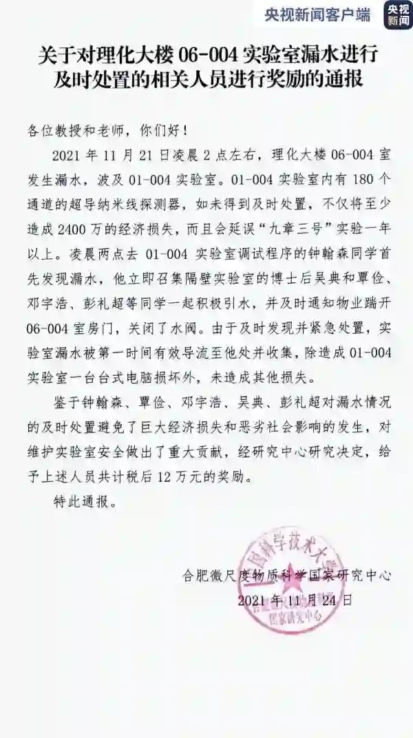 中科大5名学生处置一起漏水事件,拿了12万元奖励...