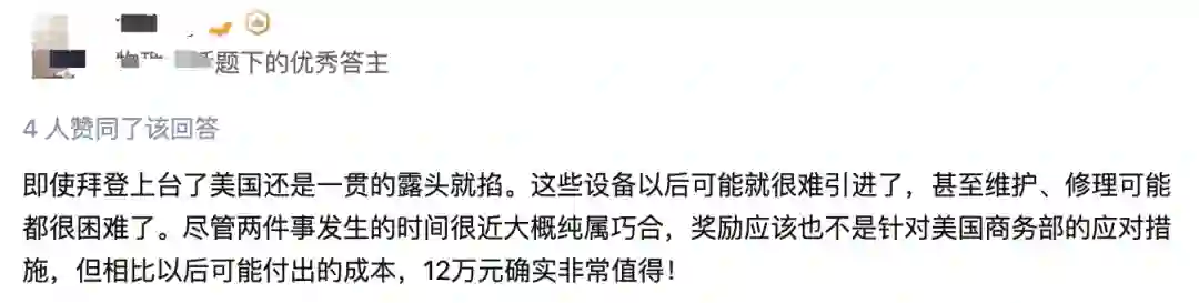 「这些设备以后可能就很难引进了,甚至维护、修理可能都很困难了。尽管两件事发生的时间很近大概纯属巧合,奖励应该也不是针对美国商务部的应对措施,但相比以后可能付出的成本,12万元确实非常值得!」