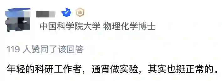 同样来自中科大的物理化学博士也站出来表示,「年轻的科研工作者,通宵做实验,其实也挺正常的。」