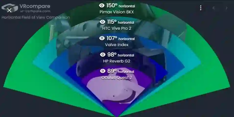 然而,没有任何头显能够容纳普通人的完整FOV。当今的VR硬件设计人员的目标是创建允许180度FOV的设备,他们正在朝这个理想努力。
