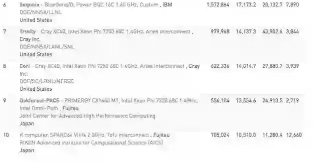 排名第七的也是一个新系统,由洛斯阿拉莫斯国家实验室和桑迪亚国家实验室运营的Cray XC40超级计算机Trinity。它最近升级了英特尔“Knights Landing”Xeon Phi处理器,从六个月前的8.10 petaflops提升到目前的14.14 petaflops。