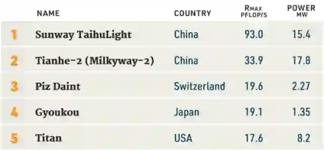由中国国家并行计算机工程技术研究中心(NRCPC)开发,部署在无锡国家超级计算中心的神威·太湖之光系统第四次蝉联第一,高性能Linpack(HPL)得分93.01 petaflops。