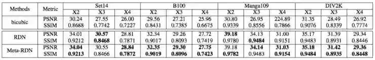 表 3:当缩放因子为 X2, X3, X4,Meta-RDN 与 RDN 的对比结果