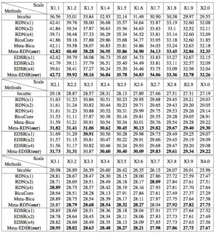 同时,Meta-RDN 也由于 Meta-Bicu, 这是因为对于在特征图插值,缩放因子越大,有效的 FOV 越小,性能下降越多。但是,在 Meta-SR 中,每个缩放因子具有相同的 FOV。受益于 Meta-Upscale,相较于其他 baselines,Meta-RDN 几乎在所有缩放因子上取得了更优性能。
