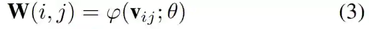 其中 v_ij 是与 i, j 相关联的向量,也是权重预测网络的输入,其可表示为: