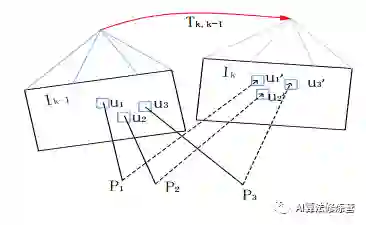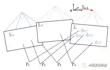 3)位姿结构优化。 如图所示,像素位置优化后,利用建立的对应关系对空间三维点和相机位置进行分别优化,构 建 像 素 重 投 影 误 差 的 优 化 函 数