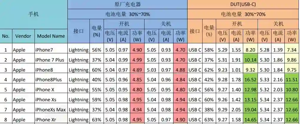 我还测试了手头上的一些老设备,除了 iPhone 7 以外,在开机状态下都能激活 PD 快充。