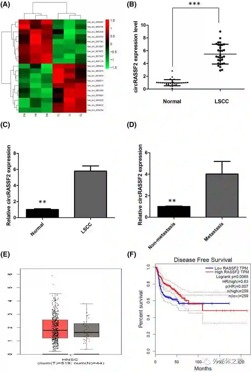 图:在LSCC组织中表达异常的circRNA,其中circRASSF2在LSCC中高表达并预测了不良的肿瘤行为