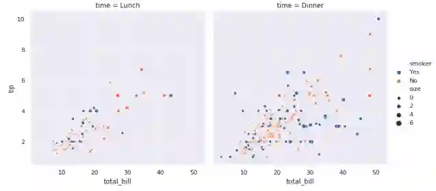 import seaborn as snssns.set()tips =sns.load_dataset("tips")sns.relplot(x="total_bill",y="tip", col="time", hue="smoker",style="smoker", size="size", data=tips);