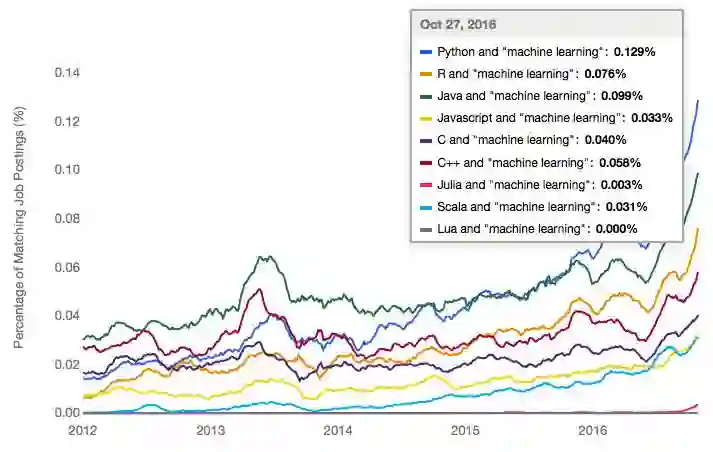举一个简单的例子,在机器学习领域,python位于最受欢迎的编程语言第一位,遥遥领先。也因为 AI 方向日益火热,python 岗位的薪水水涨船高。