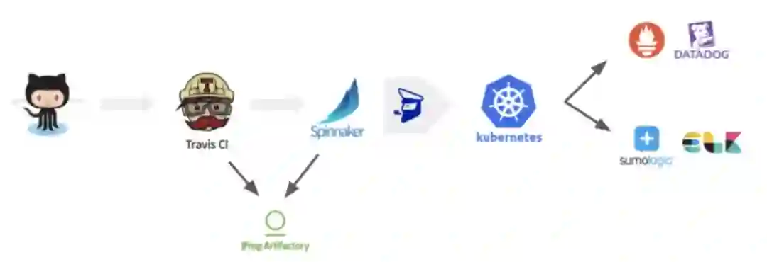 平台包括:GitHub、Travis、Artifactory、Spinnaker、FIAAS、Kubernetes、Prometheus、Datadog、Sumologic 和 ELK 等组件。