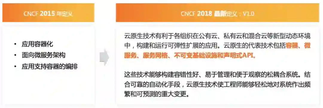 2015 年 CNCF 掺和进来,最初把云原生定义为:应用容器化、面向微服务、容器编排。到了 2018 年,CNCF 更新了云原生的定义,加入了声明式 API 和服务网格(2017 年社区新技术,和微服务并列,注意它不是微服务的升级版本),这些技术能够构建容错性好,易于管理和便于观察的松耦合系统。