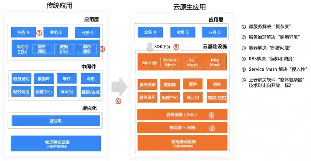 上面提到了 “云” 有很强大的能力,云上应用该如何适应,那么相比传统应用,新应用从软件架构的设计,开发,构建,部署,交付,监控及运维等整个应用生命周期各环节都需要被重塑,我从 “问题” 的角度切入讲一下: