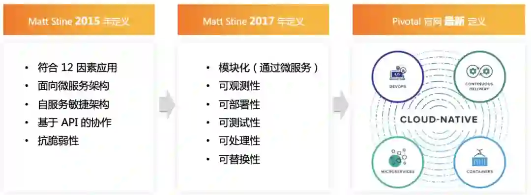 Pivotal 公司的 Matt Stine 于 2013 年首次提出云原生(Cloud Native)的概念。2015 年,云原生推广时,Matt Stine 在《迁移到云原生架构》的小册子中定义了符合云原生架构的几个特征:12 因素应用、微服务架构、自敏捷架构、基于 API 协作、抗脆弱性。到了 2017 年,Matt Stine 改了口风,将云原生架构归纳为:模块化、可观测性、可部署性、可测试性、可处理性、可替换性等 6 大特征。而 Pivotal 最新官网对云原生概括为 4 个要点:DevOps、持续交付、微服务、容器。