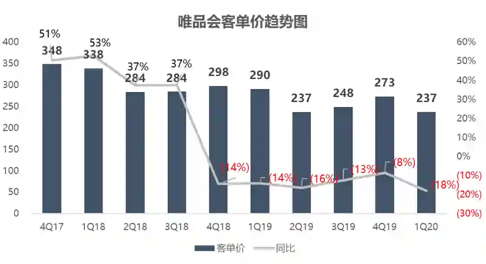 首先是客单价的降低。财报数据显示,2020年第一季度,唯品会客单价由上季度的273元下降至237元,环比下降13%,同比下降18%。。