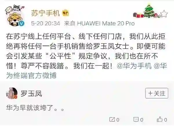 随后,苏宁手机转发了罗玉凤这条微博并表示,在苏宁线上任何平台、线下任何门店,我们从此拒绝再将任何一台手机销售给罗玉凤女士。即便可能会引发某些“公平性”规定争议,我们也在所不惜。尊严不容践踏,我们在一起!苏宁手机官微同时@华为手机和华为终端官方微博。