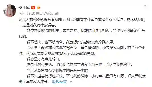 在罗玉凤删除关于华为言论的微博后,今天上午她在微博发表了关于此前言论的解释,表示自己之前并不清楚华为事件,听了朋友解释才知道原委。