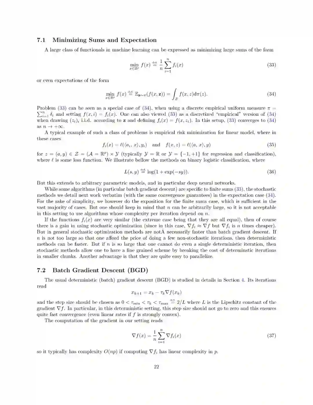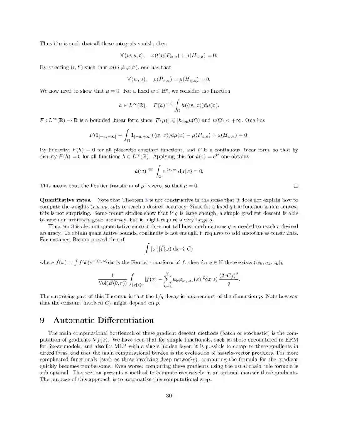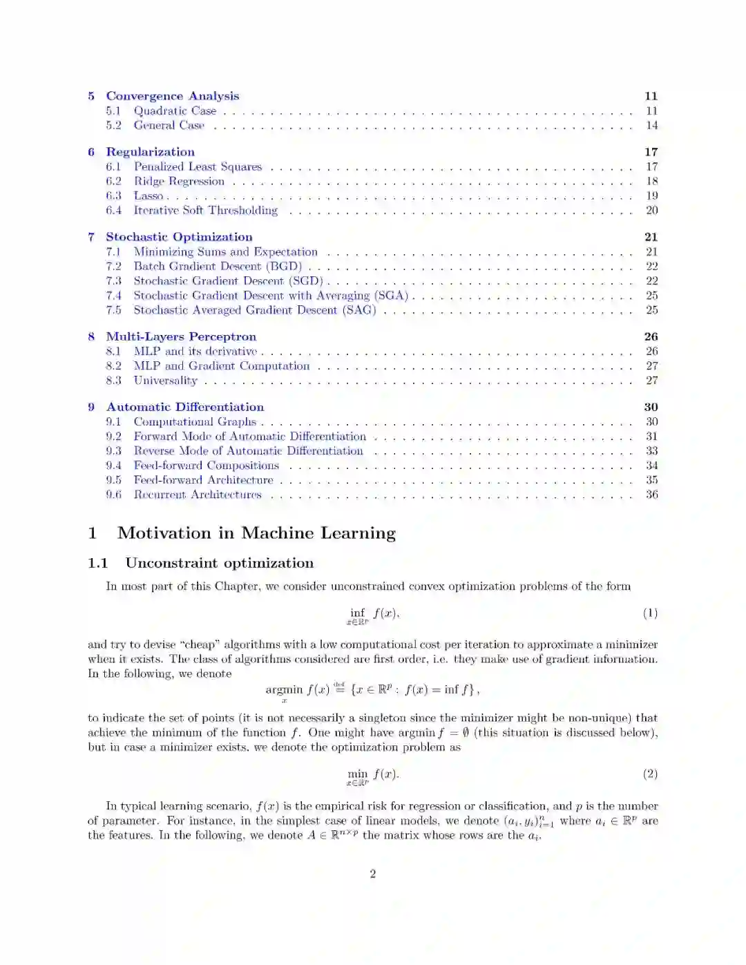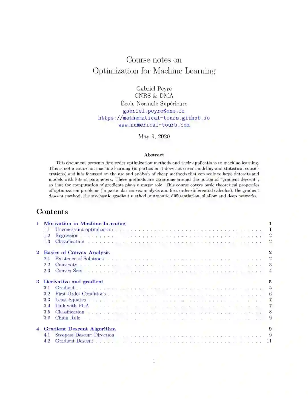 本文介绍了一阶优化方法及其在机器学习中的应用。这不是一门关于机器学习的课程(特别是它不涉及建模和统计方面的考虑),它侧重于使用和分析可以扩展到具有大量参数的大型数据集和模型的廉价方法。这些方法都是围绕“梯度下降”的概念而变化的,因此梯度的计算起着主要的作用。本课程包括最优化问题的基本理论性质(特别是凸分析和一阶微分学)、梯度下降法、随机梯度法、自动微分、浅层和深层网络。