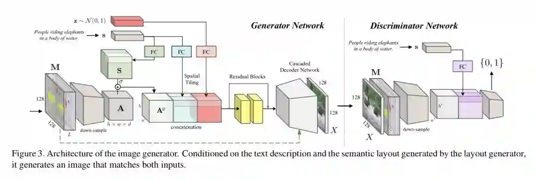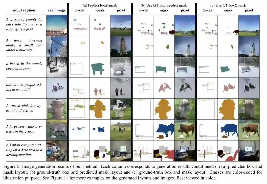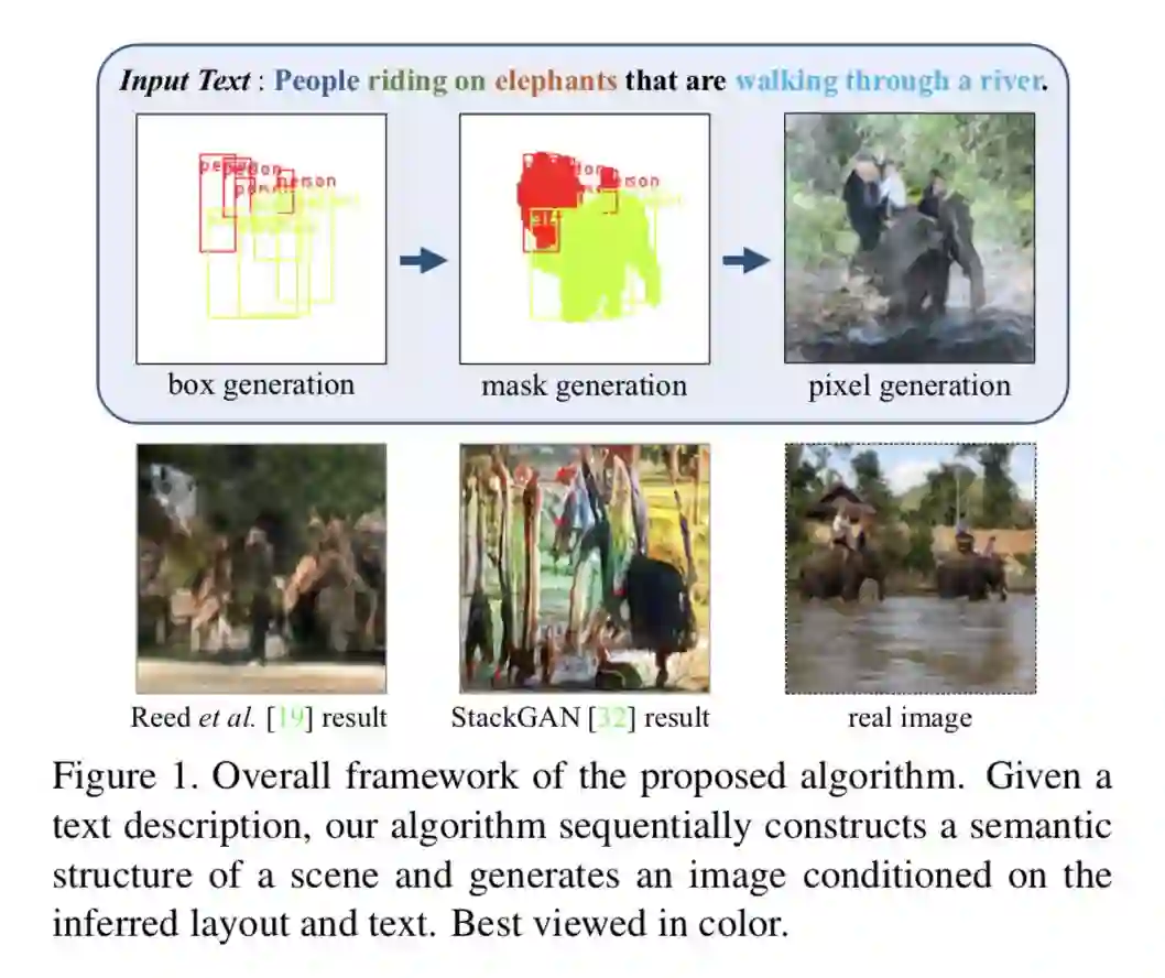 本文是密歇根大学和 Google Brain 发表于 CVPR 2018 的工作,论文首先从文字用一个 box generator 预测出物体类别所在的 bounding box 的位置,然后用 shape generator 在 box 的基础上生成更细腻的 mask,最后把 mask 和文字信息输送到 image generator 进行图片的生成。